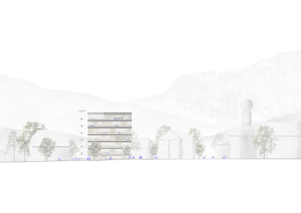 So wie der Kirchplatz durch die Pfarrkirche geprägt wird, ist die Volksschule am Sternplatz der Ankerpunkt der neuen Ortsentwicklung. Das würfelförmige Schulgebäude hat einen minimalen Fußabdruck, wodurch die Freiflächen der Volksschule verdoppelt werden können. Da diese Freiflächen niveaugleich an den öffentlichen Raum anschließen, wird die neue Volksschule auf sehr selbstverständliche Weise Teil des Lebens von Schruns.